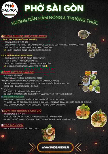 Để có hương vị hoàn hảo nhất, hãy hâm nóng nước dùng, bánh phở và thịt thật nóng trước khi dùng.